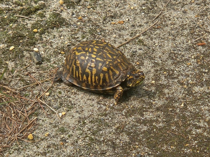 The forest is lush and the Eastern Box Turtles are doing their best to impersonate speed bumps on the trails. I’ve moved three or four of them this season. I’m back on the trails after my accident, taking it easy and enjoying the humid mornings. I saw an Eastern Towhee up close on a recent ride, a rusty-bellied bird like a smaller, squatter Orchard Oriole. I’ve heard plenty of their calls, but this is the first time I’ve had a good look.