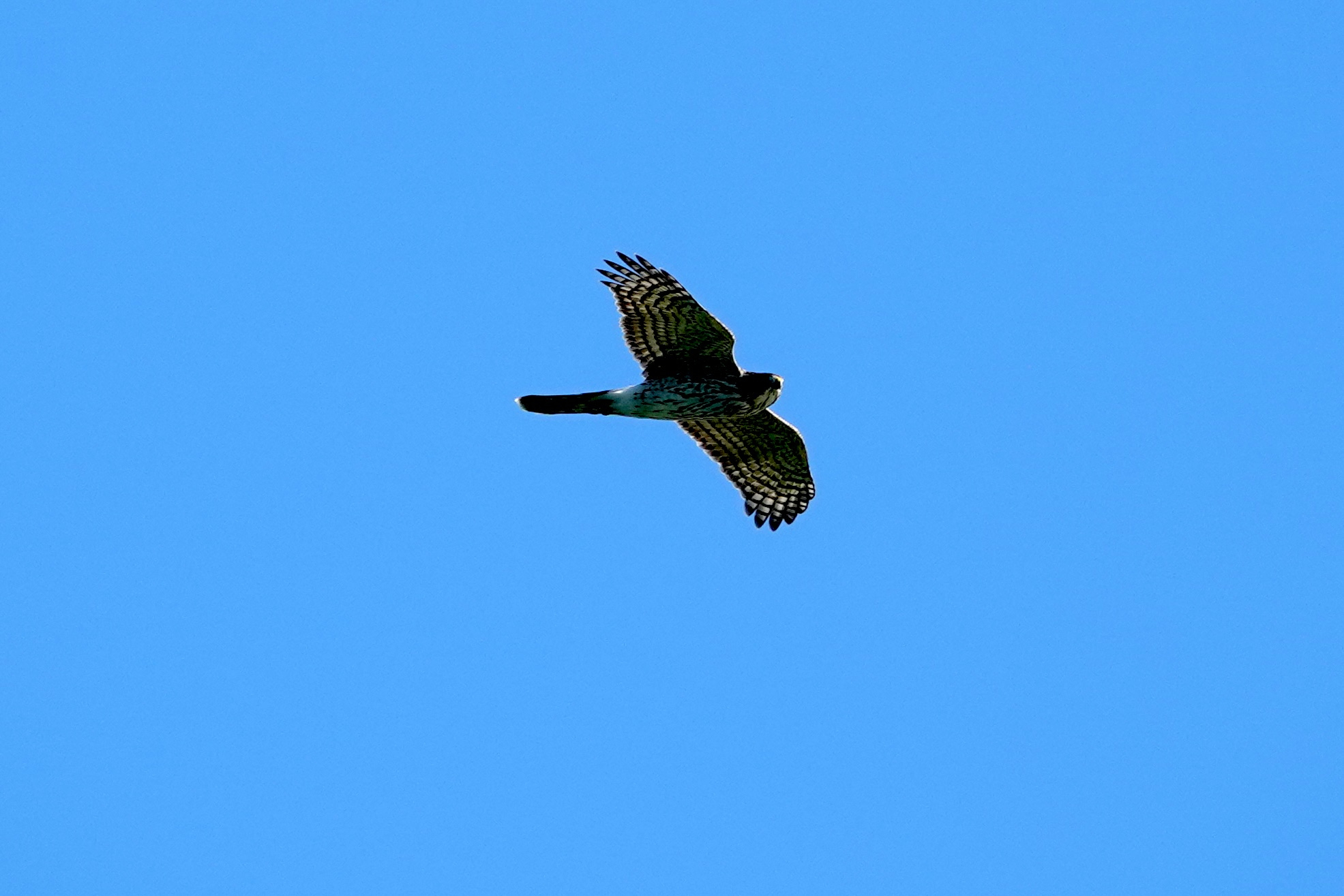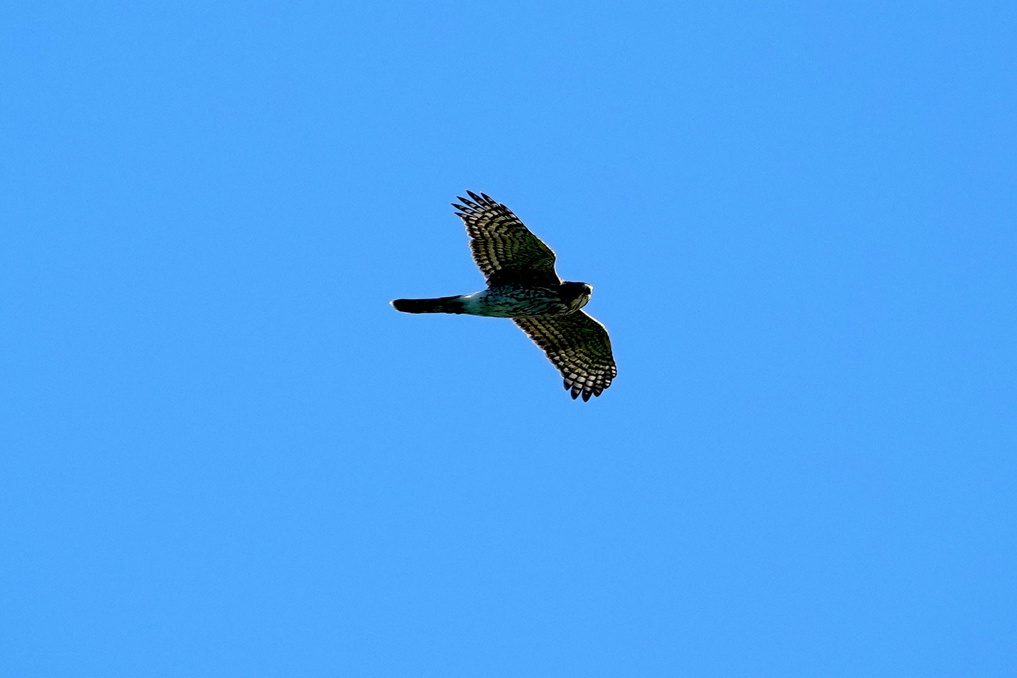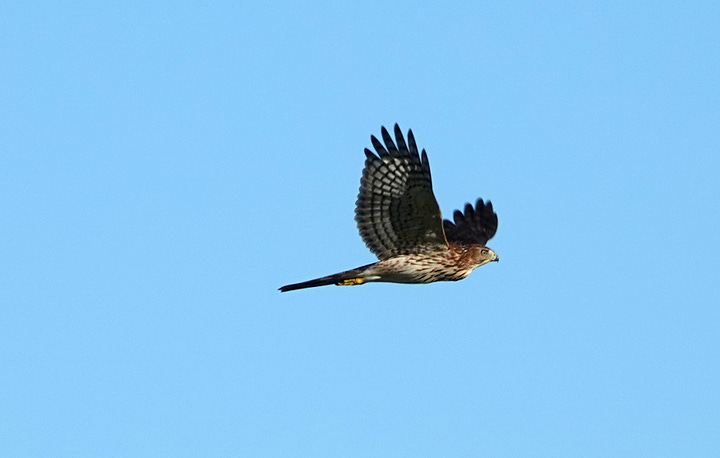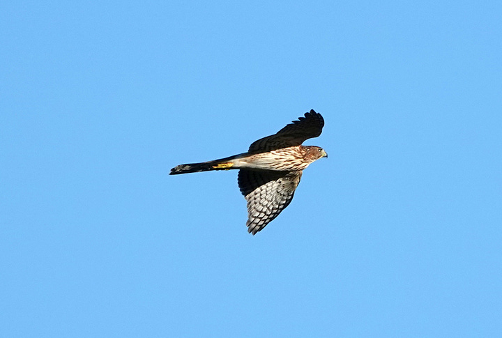 This morning, I saw a hummingbird, and heard Cedar Waxwings and those elusive Goldfinches, but they were deep in the branches, before they all went silent. I crossed the park from one favorite perch to another, and then heard a Gray Squirrel’s warning call, and looked to the sky in time to snap this Cooper’s Hawk as it flew from where I’d been to where I was headed. This one ensured that all I’d see or hear that morning were Gray Catbirds and squirrels warning everyone to take cover.