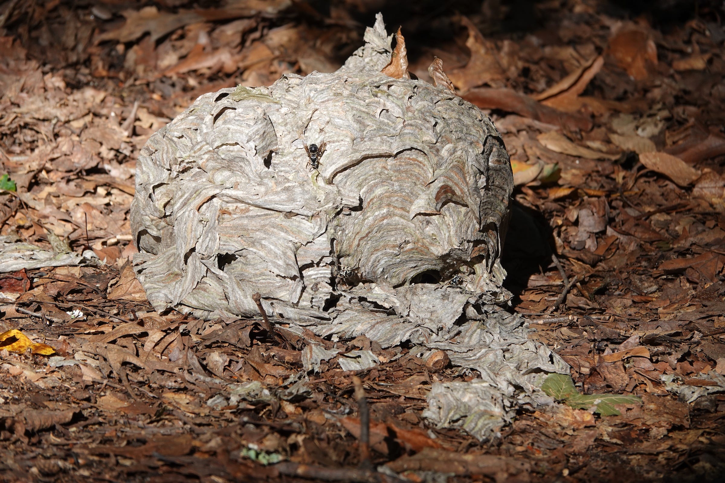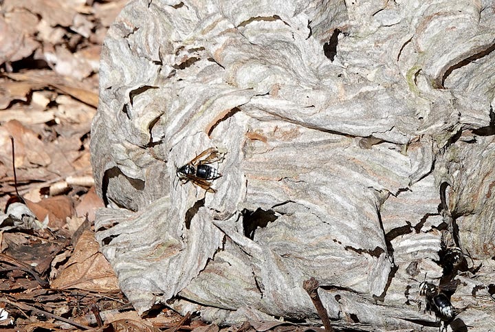 It pays to be observant. I met some equally striking, but more aggressive fliers shortly after. A tree had fallen on the edge of the trail, which must have been home to a nest of Bald-Faced Hornets; the unbroken nest rested one step off the trail, buzzing with the white-faced yellowjacket workers as they flew in and out the holes. They have a queen and are known to “vigorously defend” a nest, so these photos were taken at full zoom.