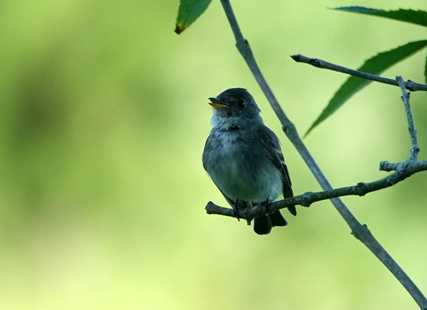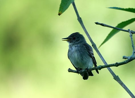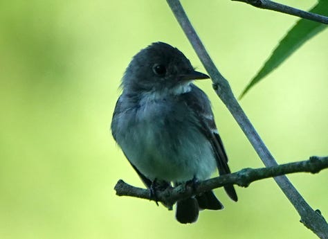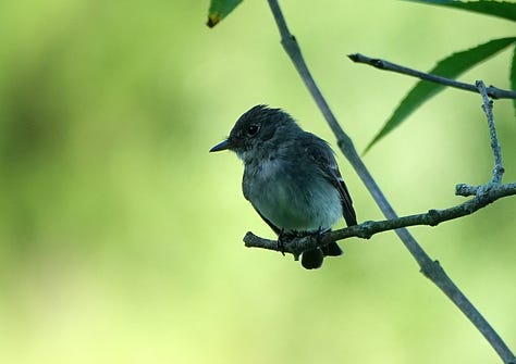 Except for one brave little Eastern Wood Pew-Wee. I’m proud of this photo! This small bird is more often heard than seen, at least for me. Named for their call, I hear them from spring on through autumn. Perhaps this little fellow was warning others as he sang from the low branch of a small tree instead of the usual perch in higher, deeper cover, but I was grateful. I managed to use another tree as my own cover, and approach for a zoom shot through the branches. I’ve only seen these a few times, high above, and these are my first photographs of one.