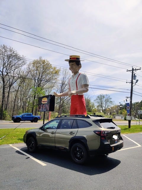 One thing you can see in any vehicle is vintage American roadside kitsch, and this “Mortimer Snerd” muffler man statue at Mr Bill’s ice cream and hot dog stand is a perfect specimen: