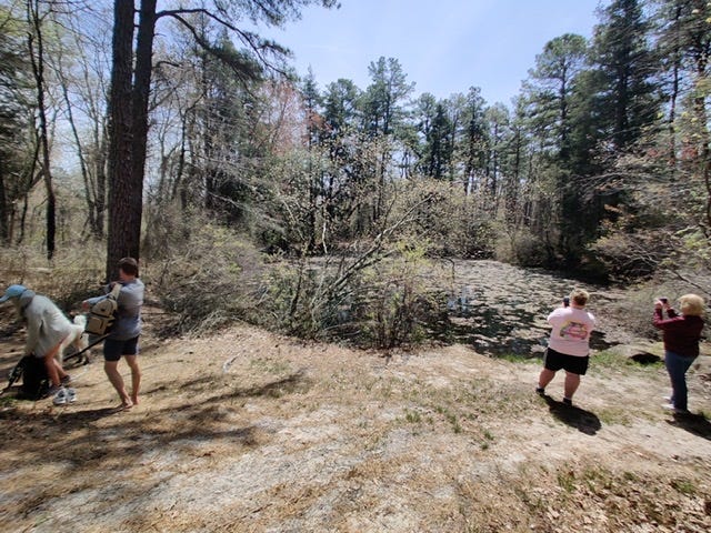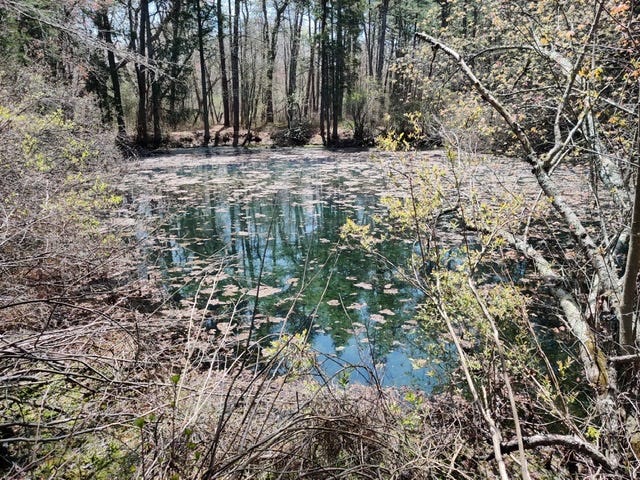 Once you see these, park and go on foot. You could get a vehicle down the trail but it’s narrow and there’s no safe turn-around. This is also a popular spot for dog walkers, and you’d be that jerk who makes people jump off the trail into the weeds to let you by. I didn’t meet any puppies this day, but I did meet two Van Life Instagrammers and a couple who parked their red Jeep next to my car and followed me in. This spot is no secret. In fact there are three brick fire pits around it. As you can see, if the Jersey Devil still bathes here, it isn’t very shy: