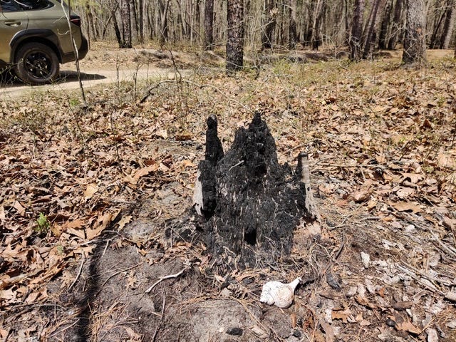Not far from here is Inskip Road, which I traveled just to see what I could see. It’s your typical Pine Barrens road, sandy hard pack with fallen boughs and washouts. I measured them and they weren’t too deep for my Squatcharu1, so I followed it back to the road. It seems mostly used by hunters and workers at a nearby crushed stone supplier who has dug their own blue hole in the sand. I found a scorched tree stump with a conch shell next to it that reminded me of Lord of the Flies. Piggy’s glasses were nowhere to be found.