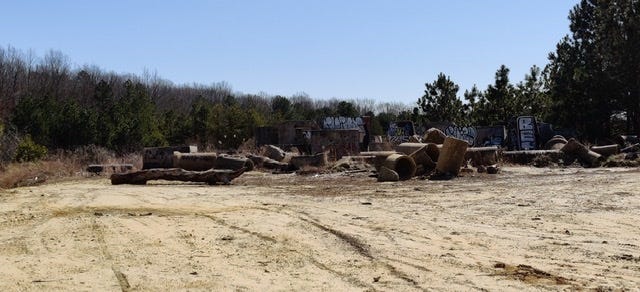 Across the road from this legendary spot is a much larger, crystal clear blue hole on the grounds of an abandoned factory for making concrete sewer pipes. The evidence is all over the place. The part of the Winslow Wildlife Management Area was recently closed to visitors, and you’ll see why.
