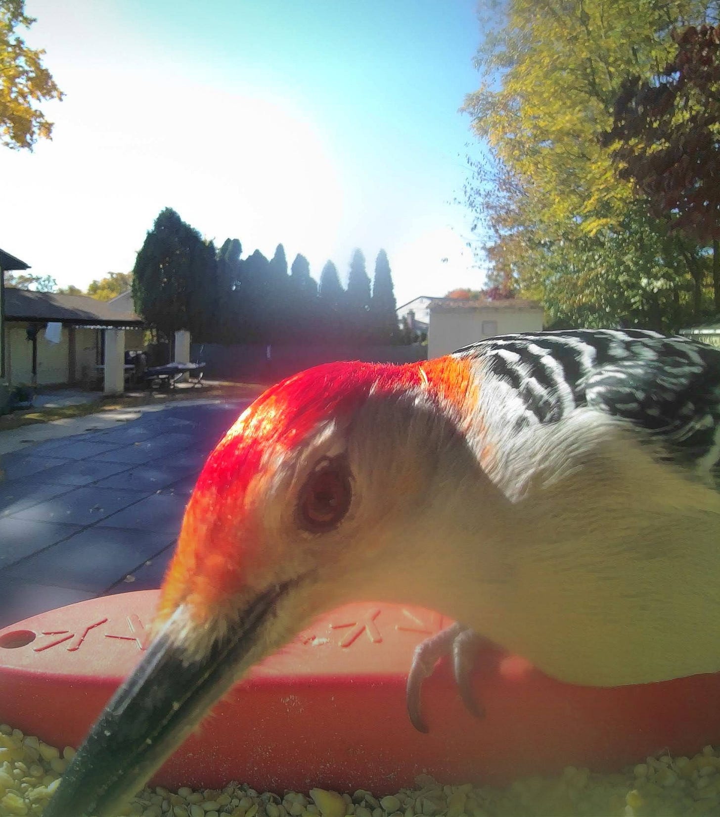 The pair of Red-Bellied Woodpeckers living nearby have continued to visit my feeder, sometimes interrupted by a surprisingly patient Blue Jay. The blue bully is outmatched by the jackhammer face of the larger woodpeckers, and hasn’t tried mimicking a hawk’s cry to frighten them off. That surprised me, because one of the jays around here has done it. Maybe the visit from the Cooper’s Hawk put an end to that. We’ve got a little fierce Downy Woodpecker too.